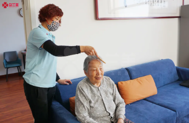 △生活助理正在幫尚奶奶整理頭發(fā)